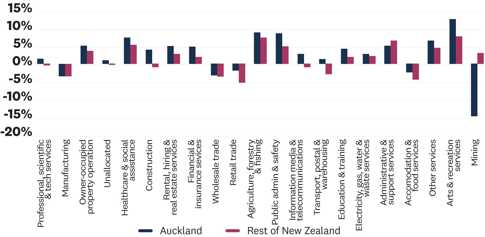 Auckland’s largest industry, ‘professional, scientific and technical services’, saw more subdued growth of 0.9%.